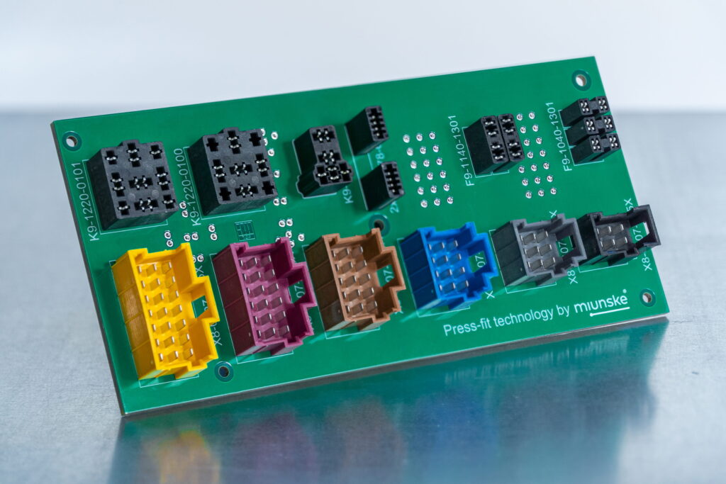 Robuste elektrische Baugruppen und Leiterplatten setzt miunske in Einpresstechnik in der hauseigenen Fertigung um. Neben der THT- und SMT Bestückung ist das Einpressverfahren eine der zuverlässigsten Methoden bei der Leiterplattenbestückung. Dabei verwendet miunske bevorzugt Einpresskomponenten aus eigener Herstellung. Mittels geeigneter Einpressmaschinen und den passenden Werkzeugen werden die Einpresskomponenten mechanisch auf der Leiterplatte aufgebracht indem die speziell geformten Einpresspins in die entsprechenden metallisierten Bohrungen der Leiterplatte gedrückt werden.